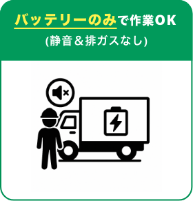 - 蓄電池により、エンジン停止状態(騒音・排ガスなし)で作業可能。 屋内や火気厳禁場所でも◎。