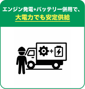 - エンジン直結発電機+蓄電された電力を合成し、「大電力給電」も可能。